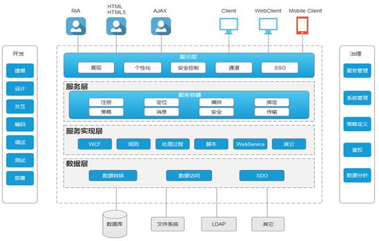 系统架构参考SOA架构模型,从上至下分为多个部分,每个部分负责一部分相对比较单一职责,然后通过上下层的依赖和调用组成一个完整的系统。